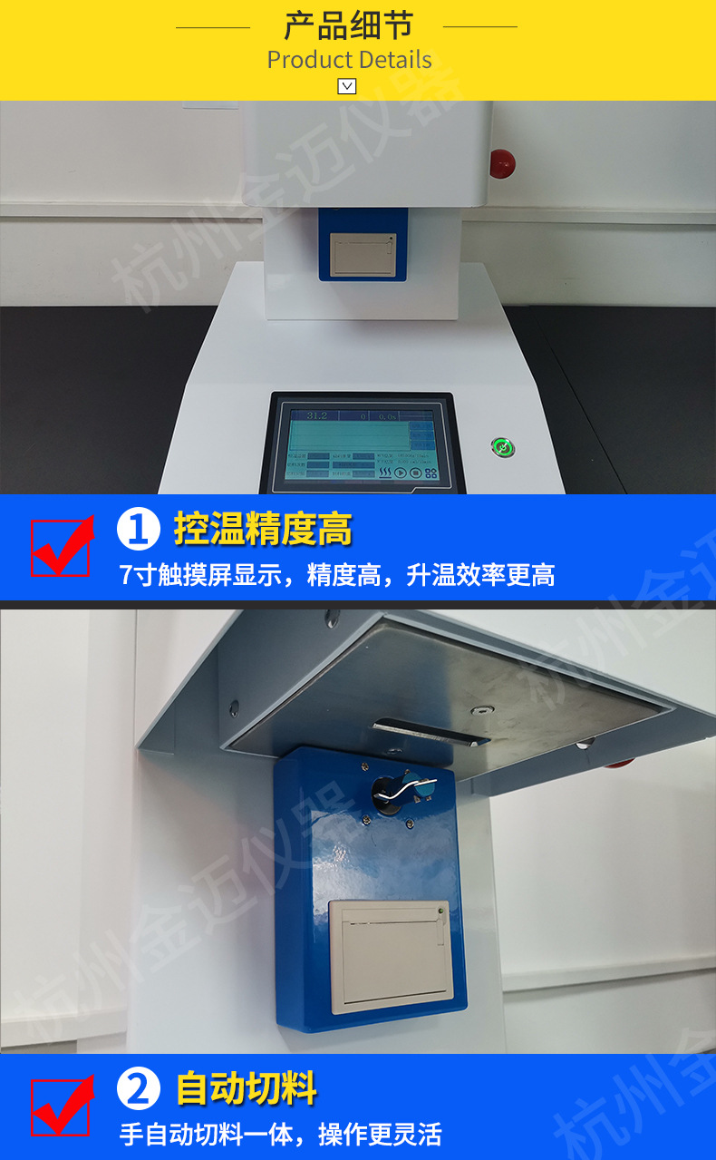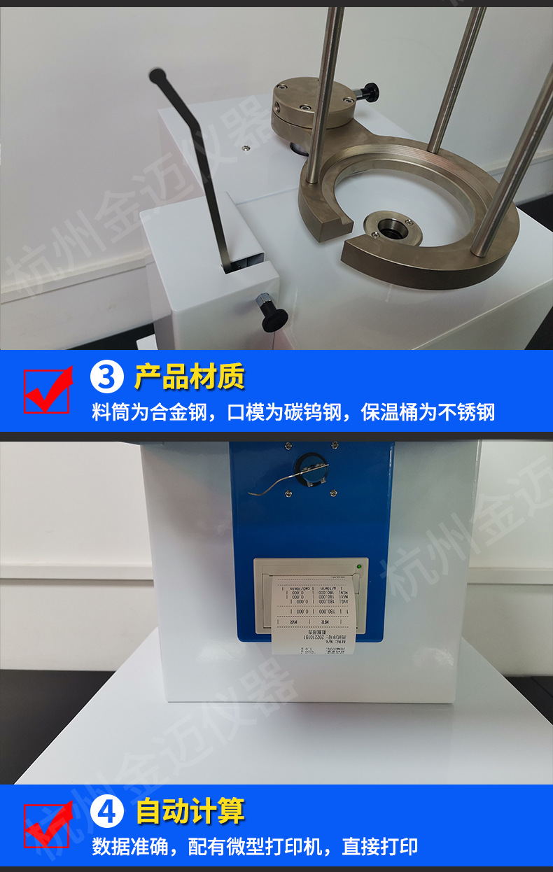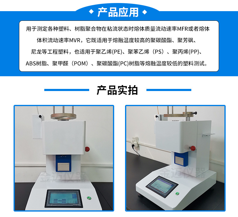 用于測定各種塑料、樹脂聚合物在粘流狀態時熔體質量流動速率MFR或者熔體體積流動速率MVR,它既適用于熔融溫度較高的聚碳酸酯、聚芳砜、氟塑料、尼龍等工程塑料,也適用于聚乙烯(PE)、聚苯乙烯(PS)、聚丙烯(PP)、ABS樹脂、聚甲醛(POM)、聚碳酸酯(PC)樹脂等熔融溫度較低的塑料測試。