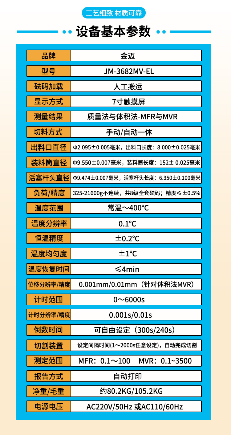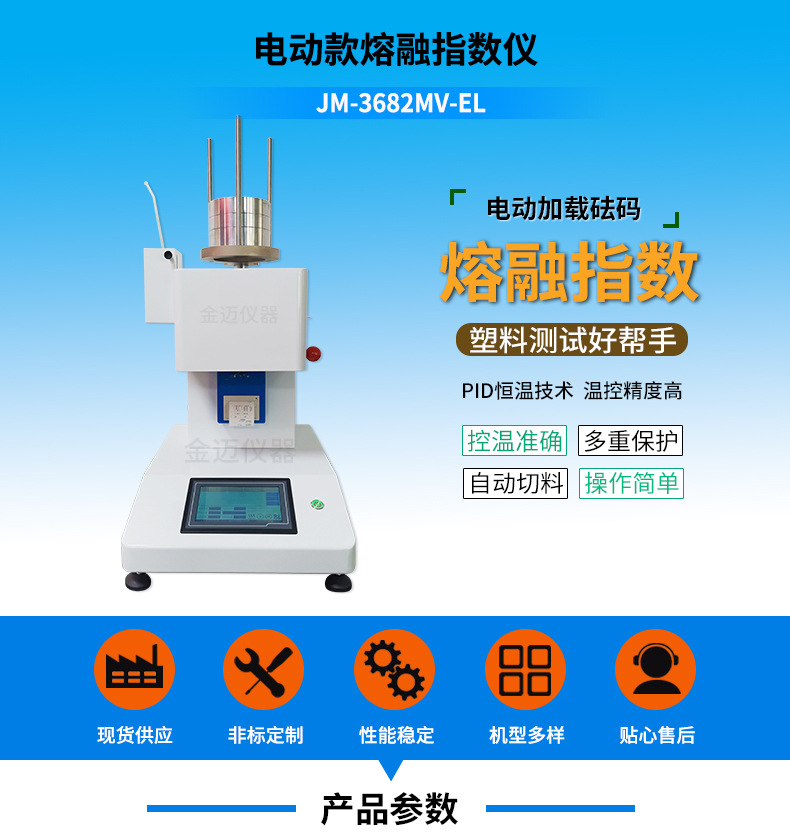 本系列熔融指數儀為快速精準測量而特別設計,具有結構堅固操作簡便、性能穩定可靠等特點;使用了高精度的PID恒溫技術,溫控精度高關鍵零件氮化處理,強度硬度高,熱膨脹變形小 JM-3682M-EL和JM-3682MV-EL為電動加載砝碼帶自動切割的機型,是指預先將一組砝碼放置在砝碼托架上,實現電動加載和卸載,減少人工操作
