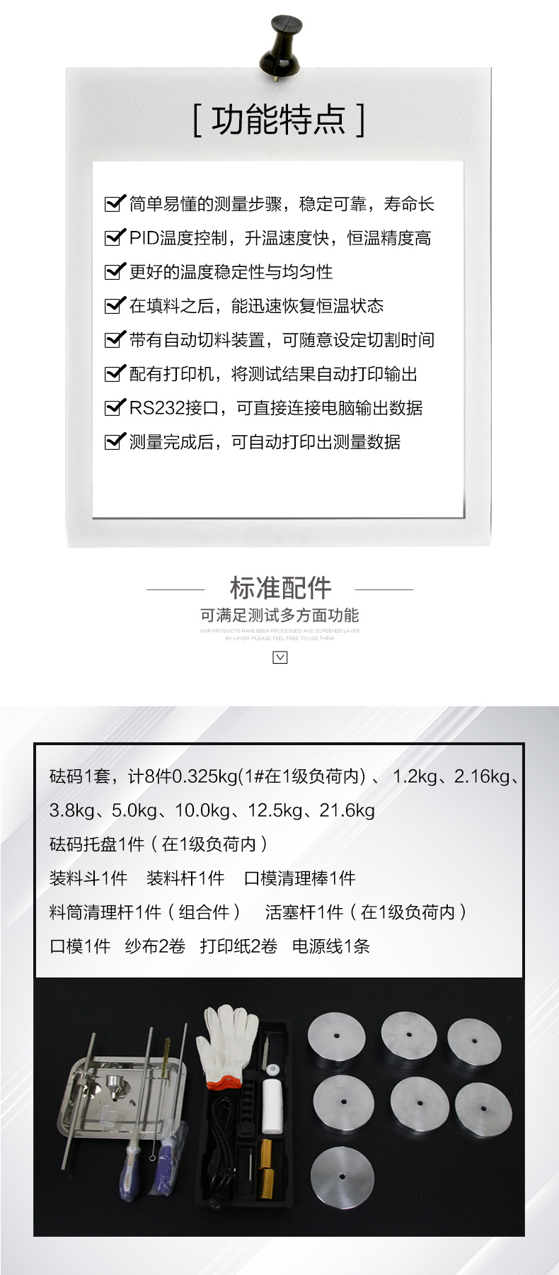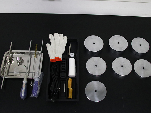 1.砝碼托盤1件(在1級負荷內),說明書1份,合格證1份,裝料斗1件,口模清理棒1件