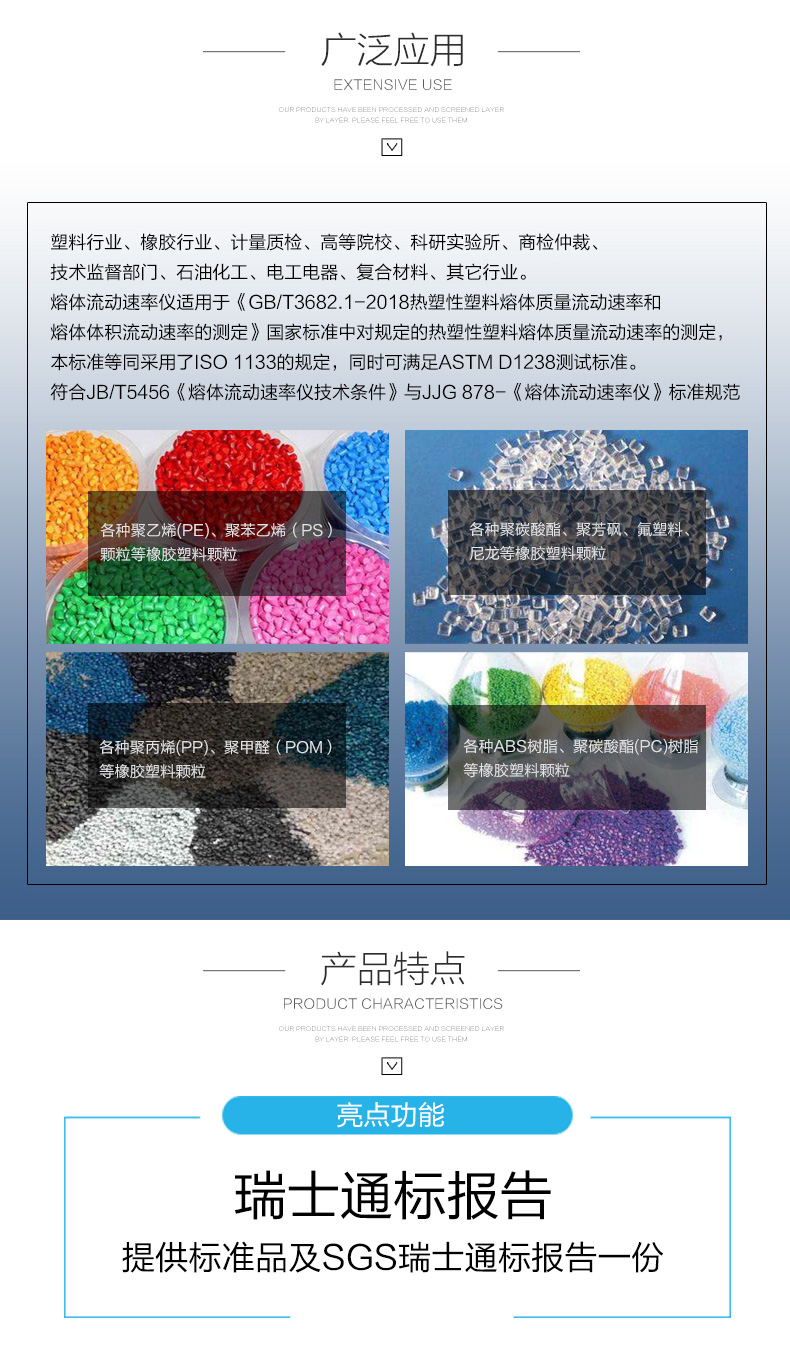 4.內置多款塑膠材料熔融指數測試條件,方便客戶隨時調取使用,減少繁瑣的工作量,并儲存一次測試條件和結果。